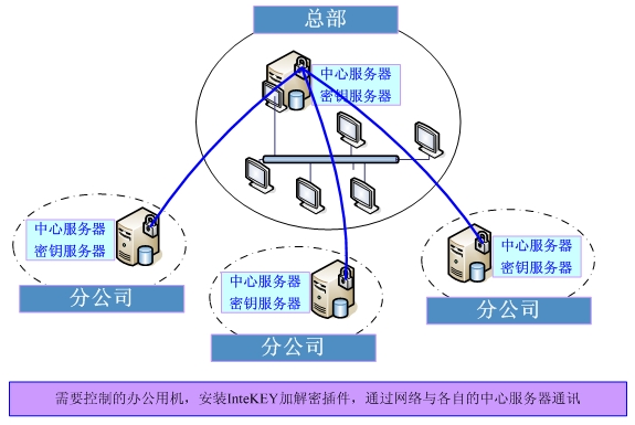 集中部署:由集團公司信息中心部署中心服務器,控制臺采用系統級管理控制臺和分支級管理控制臺的部署策略。由總公司信息中心統一對各分部加密系統包括各權限功能的集中管理、各項策略的統一下發、流程定制和應用等系統功能進行分配和調度。該方式對網絡環境要求較高,要求各子公司能通過VPN連接到企業局域網。