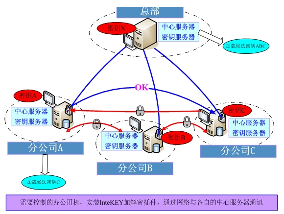 下圖為某企業的多密鑰部署示意圖:總部能打開所有分公司密鑰文件,分公司A能打開分公司C的加密文件,其余的各子公司相互均不能相互借閱和打開加密文件。