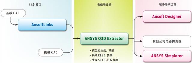 ANSYS Q3D Extractor通過Ansoftlinks可以方便導入各種CAD模型,ANSYS Q3D Extractor得到的仿真結果可以與Ansoft Designer、ANSYS Simplorer以及其他各種SPICE或IBIS兼容仿真器進行電路仿真,結合IC器件模型進行整個系統仿真。