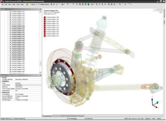 一旦幾何模型被導入,ANSYS機械解決方案就會自動探測到裝配體零部件之間的接觸面并建立接觸關系或者運動副。可以手動更改接觸關系或者運動副的設置和選項,也可手動生成接觸。對于柔性/剛體動力學的運動副也可以自動探測出。在仿真環境中,每種接觸或者運動副關系都可以用軟件中的圖形工具輕松顯示出來。