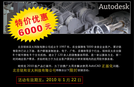 近日,以設計、創新、護航者為理念的北京銳和亞太科技有限公司與全球二維和三維設計、工程及娛樂軟件的領導者歐特克有限公司(“歐特克”或“Autodesk”)宣布自2009年10月26日至2010年1月22日在中國大陸市場范圍實施“設計·飛越2010用戶回饋計劃”,針對其基于AutoCAD平臺基礎的最新2010版系列設計軟件采取大力降價激勵政策。該計劃涵蓋歐特克旗下在業界擁有最廣泛用戶群的AutoCAD2010 、輕量版的AutoCAD LT 2010,和基于AutoCAD平臺面向制造、工程建設業的系列應用軟件。
